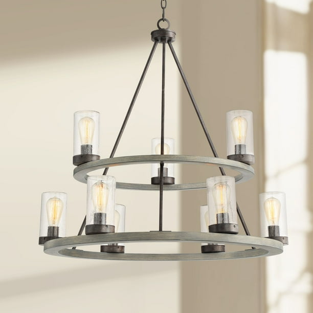 Franklin Iron Works Gray Wood Finish Bronze Large Wagon Wheel Chandelier 32 Wide Two Tier Seeded Glass 9 Light Fixture For Dining Room Walmart Com